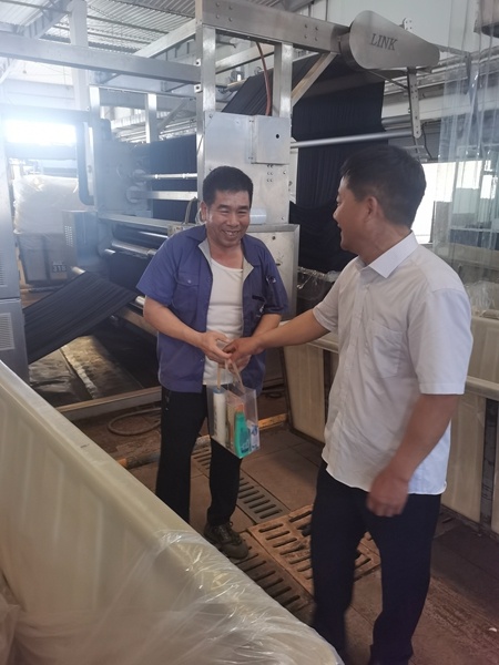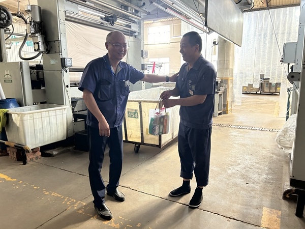 他們先后來到公司溫度最高的兩個車間染整定型、染整染色車間,向在高溫天氣中堅守崗位的一線員工表示親切的慰問和感謝。在生產現場,囑咐大家高溫生產不忘安全,做到勞逸結合;也要求各部門切實做好防暑降溫工作,保障員工健康安全。