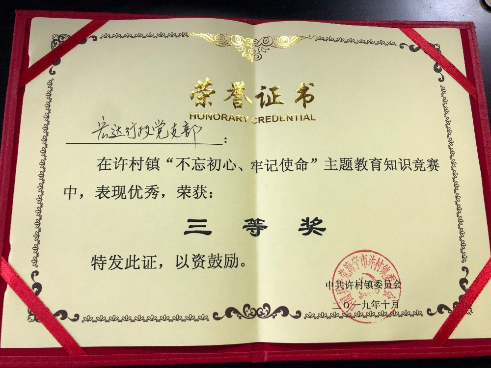 為引導(dǎo)廣大黨員干部更加全面、準(zhǔn)確、深入地學(xué)習(xí)貫徹“不忘初心、牢記使命”主題教育會(huì)議精神,進(jìn)一步深化學(xué)習(xí)教育,2019年10月25日,“不忘初心、牢記使命”主題教育知識(shí)競(jìng)賽決賽在許村鎮(zhèn)八樓會(huì)議室舉行,宏達(dá)行政黨支部代表隊(duì)在初賽中脫穎而出,與其他七支村、企事業(yè)單位隊(duì)伍進(jìn)行角逐。