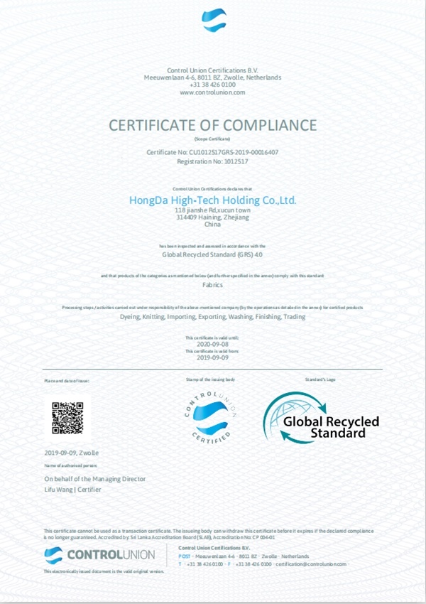 據(jù)了解,GRS認(rèn)證是全球回收標(biāo)準(zhǔn)的簡(jiǎn)稱,是國(guó)際環(huán)保認(rèn)證機(jī)構(gòu)管制聯(lián)盟認(rèn)證機(jī)構(gòu)制定的針對(duì)回收纖維所建立的驗(yàn)證標(biāo)準(zhǔn);申請(qǐng)GRS認(rèn)證的企業(yè)必須符合環(huán)境保護(hù)、可追溯、再生標(biāo)志、社會(huì)責(zé)任和化學(xué)品管理五大方面要求。
