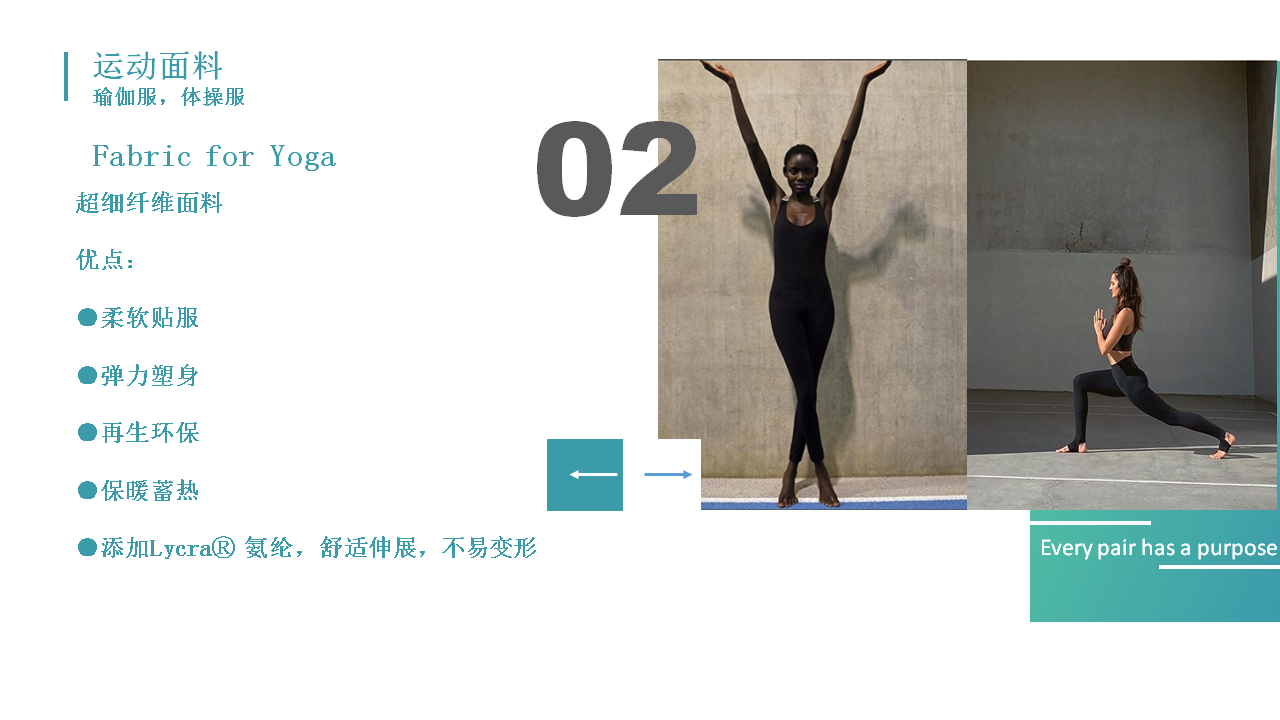公司創造性的應用進口生產設備,精心采購國際優質原材料和染 化料,所生產的彈性和尼龍面料制作各種泳衣、潛水服、內衣、 文胸、睡衣的理想面料,具有穿著舒適,觸感輕柔、恢復性好易 吸汗、不產生靜電等優點,系列產品被評為“浙江省高質量科技 產品”。生產的網眼、起絨類經編面料,更是運動衣、體操衣、 滑雪衣、球類衣等的上乘面料之選。目前,公司生產的系列面料 已通過Oeko-Tex Standard 100生態紡織品認證,品質達到 國際先進水平,批量配套阿迪達斯等世界著名品牌,遠銷歐美。